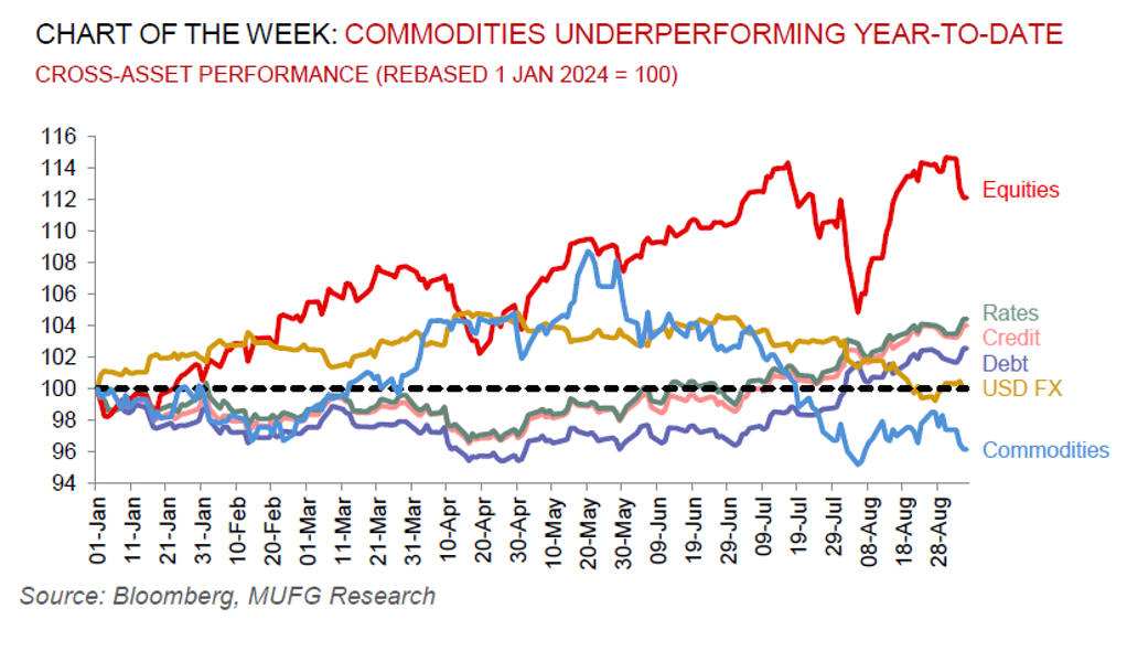 Base metals – led by copper, aluminium and nickel – remain well down from the May peaks owing to elevated inventories and China’s ongoing growth malaise (led by its ailing property sector). Yet, we believe that worst of the correction in base metals is now behind us and the latest uplift in prices has further room to run as the Fed embarks on its easing cycle – historically, the median price change in base metals 12 months after the first Fed cut is ~14 in non-recessionary episodes.