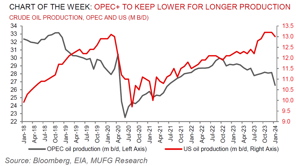 Gold’s prospects in the first quarter of year is losing some shine as expectations for a near-term Fed rate cut has ebbed – our US rates strategist has pushed back MUFG’s forecast for the first US cut from March to May. While this development is likely to extend the current phase of range-bound gold prices, with short-term moves tied to data potentially influencing Fed decision-making, we believe downside to the price will be limited by robust support from the other two channels of our trifecta outlines in our commodities 2024 outlook, namely, supportive central bank demand and bullion’s role as the geopolitical hedge of last resort (see here).