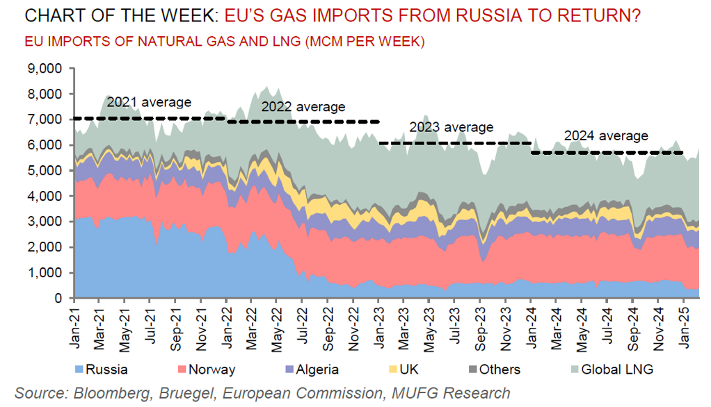 Our 2025 commodities outlook had assumed that a ceasefire between Russia and Ukraine would occur this year, given President Trump’s strategy to prioritise initiating peace talks between the two nations, by leveraging his relationships with Presidents Putin and Zelensky to broker a deal. While we take no view on any potential future deliberations, we assess what a potential peace dividend would signal for commodity markets. The most acute impact from a peace deal would be borne in natural gas markets. Should a potential peace agreement include higher Russian pipeline natural gas flows via Ukraine to Europe, then this would make it easier for European gas storage to refill ahead of the next winter season. Conditional on gas volume availability, this would place significant downside pressure to our already bearish European natural gas (TTF) average price forecasts of EUR38/MWh this year. Meanwhile, the reverberations of a peace agreement on other commodities that Russia has a comparative advantage – crude oil, metals, coal – would be more muted given prevailing sanctions have not materially affected Russian export volumes, which have been predominantly diverted from Europe to Asia.