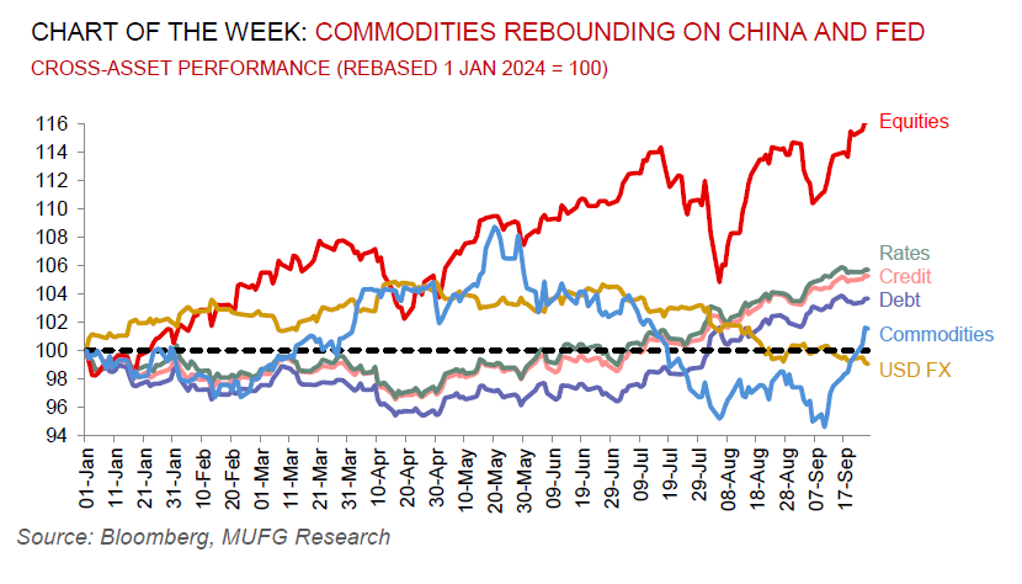 The ongoing rally in base metals – led by copper, aluminium, zinc and nickel – is now at a two month high, with the complex highly correlated to China and thus relishing in the latest raft of easing measures by the authorities. As we have frequently catalogued, we view that the sharp rates unwind in a soft landing environment offers good entry given late cycle driven scarcity, a tentative revival in global manufacturing and attractive returns – which now is further reinforced by a plethora of Chinese stimulus measures.