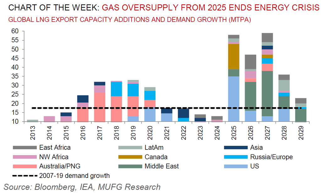 On 25 February, Qatar announced plans for further liquified natural gas (LNG) export capacity expansion by two 8mtpa trains “before the end of 2030”, that comes on top of it’s 48mpta capacity expansion currently under construction. The ramped-up target takes the country’s total LNG export capacity from 77mpta currently to now 142mtpa by 2030. When factoring in LNG export capacity currently under construction in the US (and other regions), we anticipate ~200mpta of additive global LNG supply capacity before the end of this decade, which constitutes ~50% of the 409mpta global LNG supply currently. To put the sheer velocity of this additional supply into context, global LNG demand printed at 401mpta in 2023. The resulting LNG oversupply, that will begin to take shape from 2025, leads to risks that global gas prices may decline to around supply cash costs (~EUR15-20/MWh), which in-turn could lead to the cancellation of US LNG exports (akin to 2020). At face value, although the Qatari announcement may seem counterintuitive given the approaching oversupply, we view that Qatar can leverage its pedigree as the world’s lowest cost LNG producer to take advantage of increased market share in light of the recently announced halts in US LNG export project approvals.