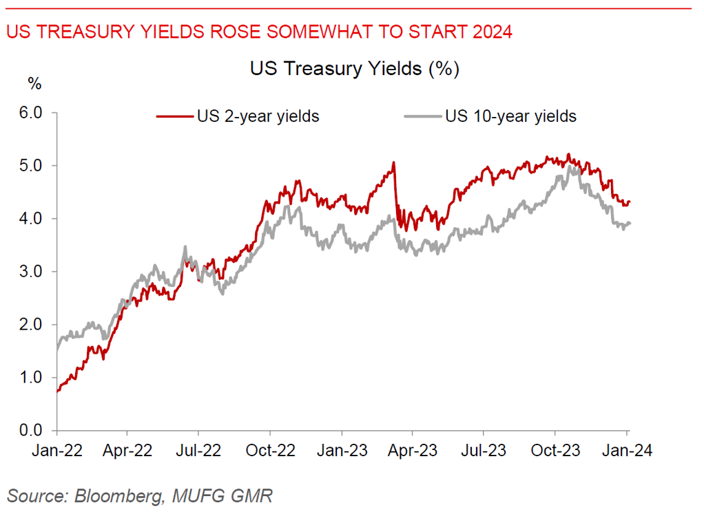 Risk sentiment was still somewhat weak to start the year, but 10-year yields stabilized at 3.91% post these data points. The risk on the Middle East conflict and global supply chain disruptions in the Red Sea would also be key to watch for moving forward.