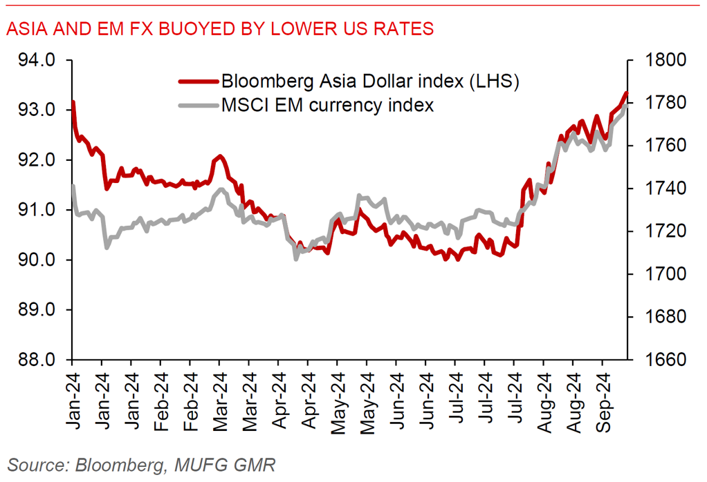 The yen weakness followed the BoJ’s policy decision last Friday to leave the policy rate unchanged at 0.25%. BoJ Governor Ueda sounded less hawkish, saying the upside risk to inflation from yen’s weakness is receding, indicating that the bank is in no rush to raise rates. Also, policymakers are wary about the impact of further rate increases on financial market stability. Meanwhile, the BoJ upgraded its outlook for consumption, while reiterating that it expects inflation to be in line with its outlook in the latter half of its forecast period through FY26, suggesting it remains on a path of rate normalisation. While 10-year JGB yield has fallen since rising to about 1% in July, there’s scope for it to rise gradually as the BoJ continues with rate normalisation and quantitative tightening.