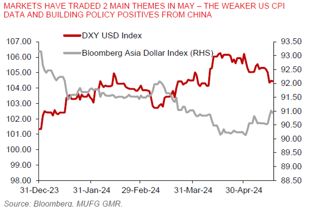 The DXY USD index fell 0.8% to 104.45 last week, as markets traded the theme of weaker US CPI data. Global sentiment also remains buoyant, with the Dow Jones Index closing above 40,000 for the first time.
