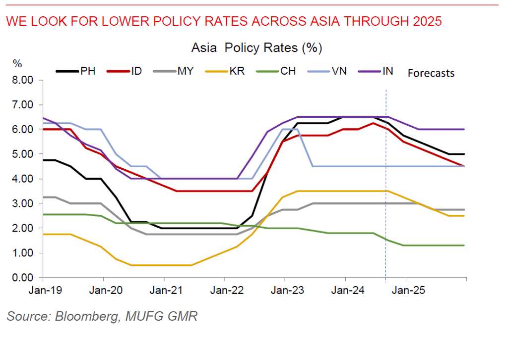 Asia ex-Japan currencies broadly weakened against the US dollar, with CNY (-0.6%), PHP (-0.6%) and KRW (-0.5%) leading losses across the Asia region. A plethora of Asian central banks will meet today. We expect BSP to cut the policy rate by 25bps amid moderating growth momentum and inflation. Despite government pressures for lower rates, our base case is for the BoT to keep the policy rate neutral at 2.50%, with economic growth improving and given the huge interest rate gap with the US. Lastly, we also expect BI to stay on hold after cutting the policy rate in September, given rising Mideast tensions. Nonetheless, conditions are in place for BI to lower the policy rate further. A potential reappointment of Indonesia’s current Finance Minister Sri Mulyani will also bode well for its fiscal outlook. Indonesia’s trade surplus was US$3.3bn in September, slightly narrower than the US$3.4bn surplus a year ago.