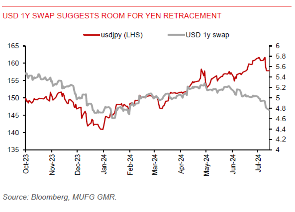 The latest US macro data could help stabilize the DXY USD index, with markets nudging down US rate cut expectations, while eyes are on the major support level at 104 for the downside. USDJPY has found near-term support at the 158.00 level, with topside at 162. A look at the USD 1y swap suggests the yen has scope to retrace.