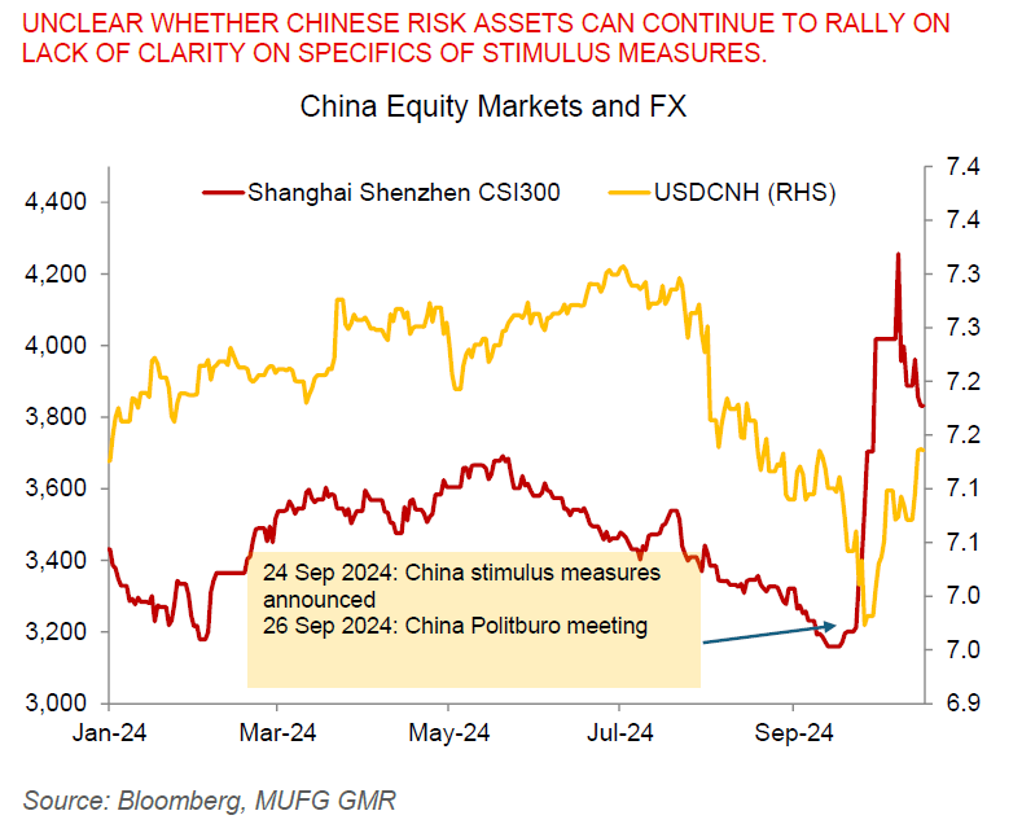 Global risk sentiment stabilised yesterday after the volatility in tech stocks induced by worse than expected earnings result from ASML. Nonetheless, the broader undercurrents of uncertainty around the US election results remain, with a variety of markets moving increasingly further to price for a Trump victory, coupled with geopolitical risk still lurking in the background all makes for a jittery market still. Later today, we will have US retail sales where consensus is expecting steady growth of around 0.3%mom. Meanwhile, US will also release initial jobless claims, where the numbers may show some impact from recent typhoons in Florida.
