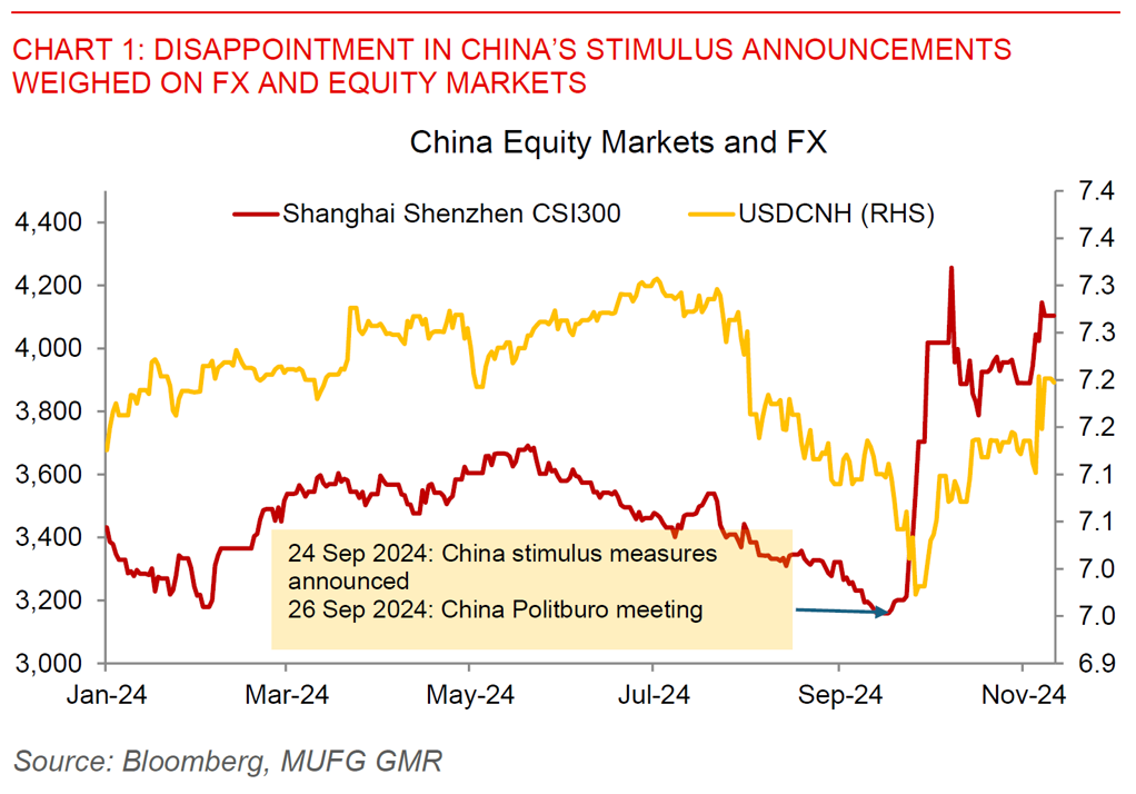 The Dollar strengthened and USDCNH rose to around 7.200, as the combination of better US data, the resumption of Trump trades, coupled with disappointment in China stimulus announcements weighed on Asian markets and currencies. In particular, Chinese authorities announced a scaled-up local government debt resolution programme, but did not immediately announce any direct stimulus to boost consumption spending, bank recapitalisation or property purchases post the National People’s Congress Standing Committee meeting. This was likely a disappointment relative to market expectations and China’s onshore equities fell and FX weakened.