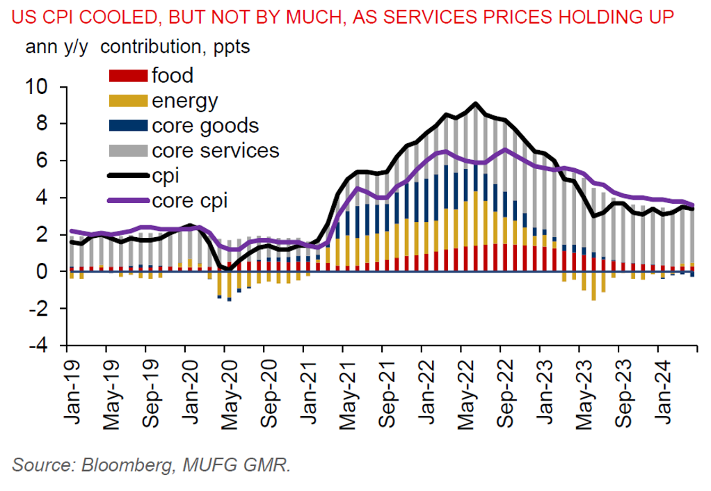 US headline CPI rose 0.3%mom in April, slower than market expectation for +0.4%mom. This brings down the annual rate to 3.4%, from 3.5% in March. Shelter - the biggest component in services - and energy accounted for slightly more than 70% of the increase. Shelter prices rose 0.4%mom for the third straight month. Meanwhile, the core inflation measure rose 0.3%mom in April, cooling for the first time in six months. This is in line with market consensus and brings the annual rate to 3.6% from 3.8% in March.
