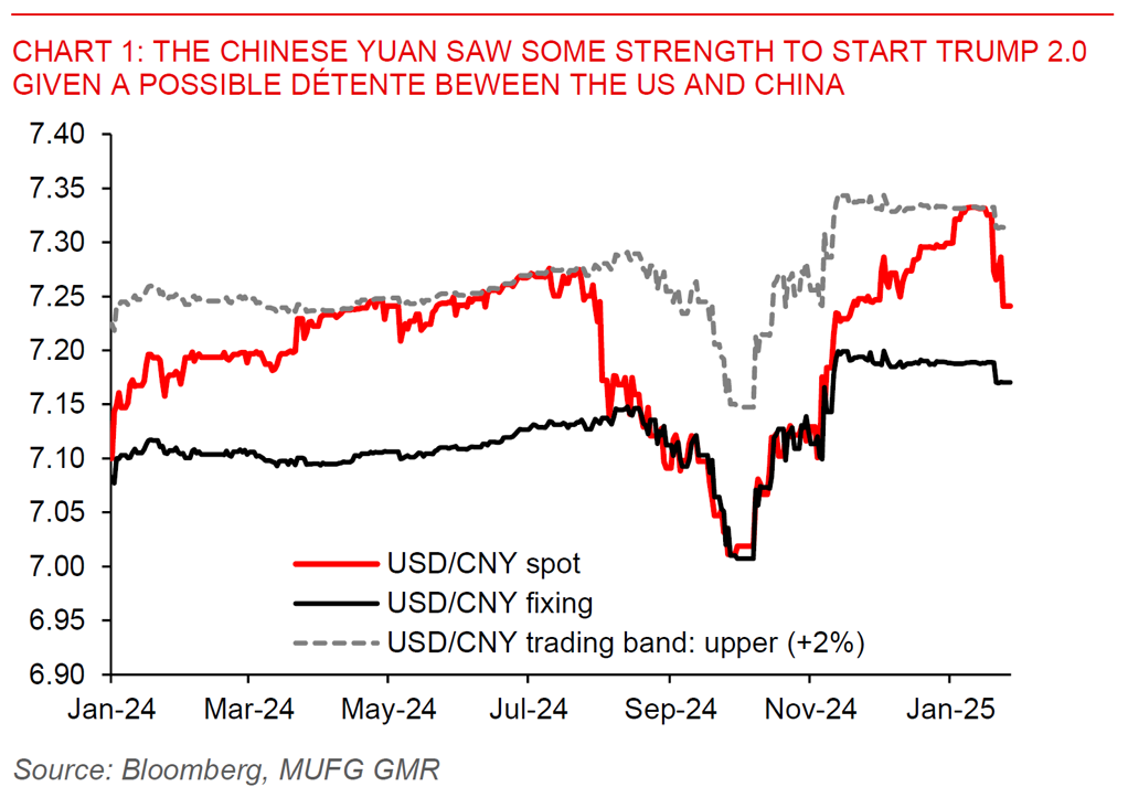 President Trump imposed tariffs and sanctions on Colombia after Colombia’s president refused to allow two military planes carrying deported migrants to land. President Trump ordered an emergency 25% tariff on all Colombian goods coming into US, which will be raised to 50% in a week, with oil, gold, coffee and flowers topping the list of US exports. While the past week has certainly brought some adjustment in stretched long Dollar positionings with the Dollar weakening meaningfully during the 1st week of Trump’s term, we are somewhat skeptical that Dollar weakness and with that Asian currency strength can continue. It’s certainly still early days, but it does seem like Trump 2.0 will use tariffs to achieve both economic and non-economic policy goals as the Colombia example exemplifies, and perhaps in a more aggressive way compared with the 1st term.