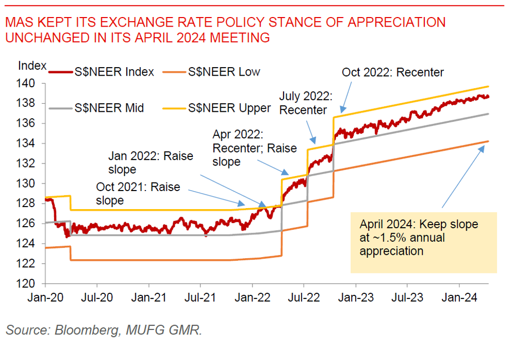 Asian FX markets traded mixed on the back of stronger US Dollar with USDSGD at 1.3532, USDCNH at 7.255, and USDKRW at 1367. China’s inflation numbers continued to remain soft with CPI at +0.1%yoy, indicating that domestic demand is still weak. Nonetheless, we have seen some improvement in manufacturing activity so far, and today’s export numbers out of China will be important to validate the pickup in export activity we are also seeing across Asia. The MAS kept its exchange rate policy stance unchanged as expected by the market. The statement was quite similar to the Jan meeting, continuing to highlight that Singapore's inflation should continue to moderate but only more noticeably so in 4Q. If anything, the statement was ever so slightly more hawkish, highlighting that the prevailing rate of appreciation "is needed to keep a restraining effect on imported inflation". The MAS continues to highlight that growth should improve through 2024 as the tech cycle turns and global central bank cuts rates. Today's 1Q advance GDP numbers were softer than expected driven by weaker manufacturing and construction, but the high frequency numbers have generally been decent. Ultimately, USDSGD should trade in line with the Dollar trend with MAS still unchanged in both its policy and statement.