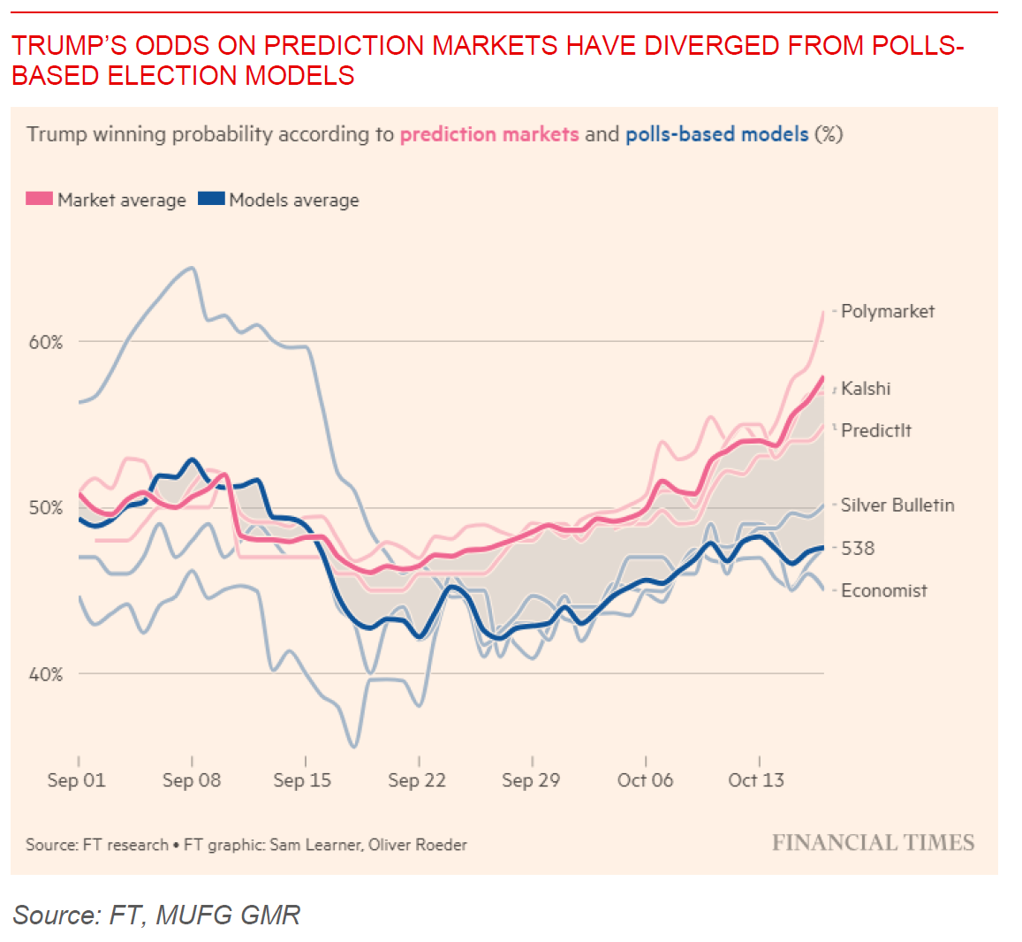 The Dollar strengthened, US 10-year yields rose, while risk sentiment took a beating as election risks dominated markets. US Prediction Markets including Polymarket, Kalshi, and PredictIt have further raised the implied probability of Trump winning to more than 60%, while also raising the probability of a Red Sweep further as well. All developments had a clear effect on US rates with the 10-year yield rising closer to 4.18% coupled with a steeper yield curve as markets tried to look forward towards possible policy shifts from a 2nd Trump administration. While the trend especially in swing states have been clearly in Trump’s favour since September, the magnitude is still clouded with significant uncertainty. In particular, polls-based election models have diverged from prediction markets assigning a lower even if rising probability of a Trump victory, with the Financial Times reporting that a small group of anonymous traders have propelled the dramatic surge in Trump’s perceived chances in prediction markets.