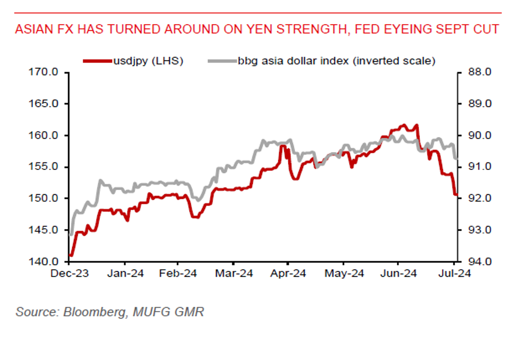 Asian currencies strengthened against the US dollar alongside the strong yen rally and expectations for US rate cuts. Low-yielding currencies such as the KRW (1%), THB (+0.9%), and MYR (+0.7%) were top performers yesterday, while more modest gains were seen in CNH (+0.2%), SGD (+0.3%), IDR (+0.2%), and PHP (+0.5%). Notably, the recent MYR rally has erased its year-to-date loss and is up 0.5% year-to-date. Meanwhile, Thailand’s improving current account surplus ($1.95bn in June vs market expectation of $350mn) will help support THB strength.