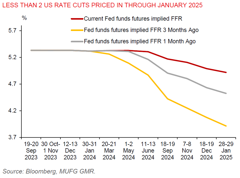 The latest US macro data show some signs of softening. The ISM factory index fell 1.1 points to 49.2 (<50 indicates contraction) in April, while JOLTs job openings were 8488k in March, down from a revised 8813k in February. Construction spending also fell 0.2%mom. However, ADP data showed private employers added 192k of jobs in April, higher than market expectation, while ISM prices paid increased by 5.1 points to 60.9, the highest level since June 2022.
