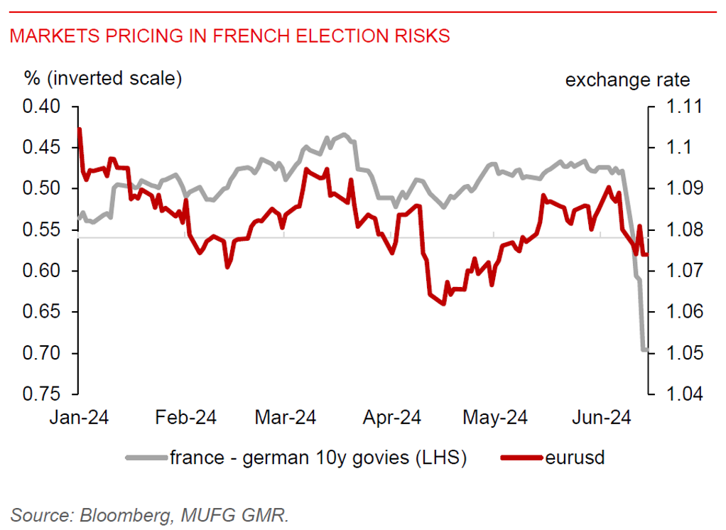 European industrial production (IP) started Q2 on the back foot, falling 0.1%mom sa in April vs. a 0.5% increase in March. This points to an unbalanced growth recovery, with services activity doing better. Europe will continue to brace for fresh election risk after French President called for a snap national election following a bruising defeat by Marine Le Pen’s far-right RN party in the EU polls. European equities, EUR/USD, and French bonds have come under downward pressure.