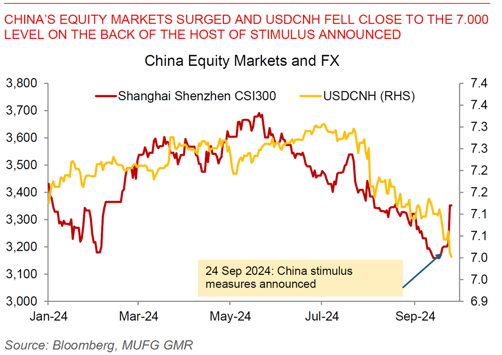 Asian FX markets were stronger, with USDCNH in particular briefly touching the 7.000 level at one point before settling around that level during Asian trading time. The weaker Dollar and lower US yields helped, but certainly the collection of stimulus measures announced by China yesterday was also an important driver. China’s equity markets rose sharply with MSCI China surging more than 5%, while onshore A shares market rising 4%. All these also had positive spillovers to other Asian currencies, with the economies most closely linked with China benefitting. MYR in particular was the standout, rising close to 1% and now touching 4.122, while KRW (+0.7%) and THB (+0.6%) also outperforming. Meanwhile, Taiwan’s export orders were stronger than expected rising 9.1%yoy from 4.8%yoy previously. We will have industrial production data for Taiwan and exports from Thailand later today and both show some continued positive trends given the regional trend thus far.