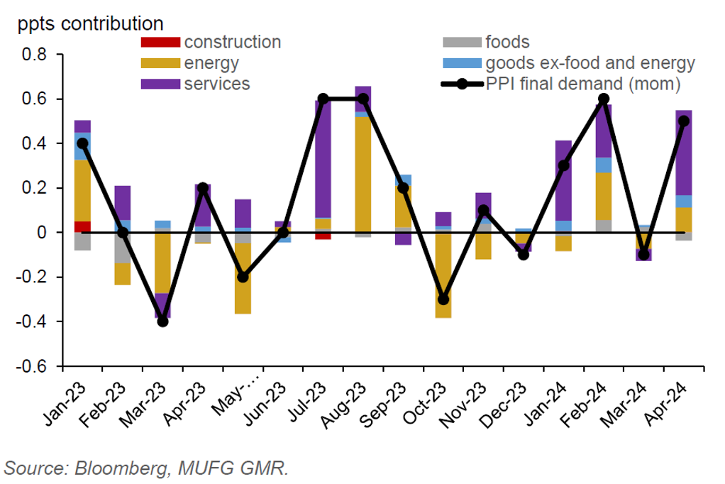 A faster than expected rise in US headline PPI in April presages a hotter US CPI reading, which will be released later today. US PPI rose 0.5%mom in April, up from -0.1%mom in March and higher than Bloomberg consensus of 0.3%. This was driven by higher sale prices of services and energy prices. And from a year ago, US headline PPI rose 2.2% in April from 2.1% in March, while core PPI steadied at 2.4%yoy. US retail sales, which will also be released later today, could slow sequentially, adding to signs of softening consumption following a nearly 10ppt drop in the University of Michigan sentiment index in May. And Fed Chair Powell has reiterated that rates will be kept higher for longer during a speech, following the lack of disinflation progress in Q1. Both US yields and DXY USD index inched down slightly.