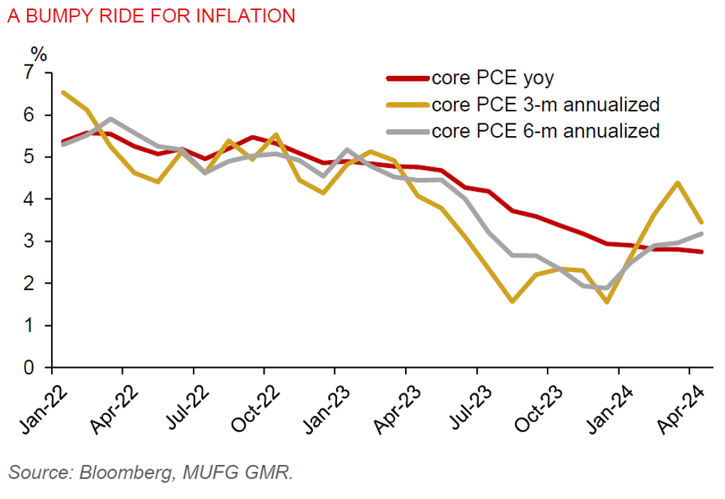 US core PCE inflation - the Fed’s preferred inflation measure - slowed to 0.2%mom in April, from 0.3%mom in March and was in line with market expectation. On a year-on-year basis, core PCE inflation was 2.8%, unchanged from the pace in March. The US 2y and 10y yields fell 5bps each last Friday following the cooler PCE inflation reading. But there’s little change in the DXY USD index.