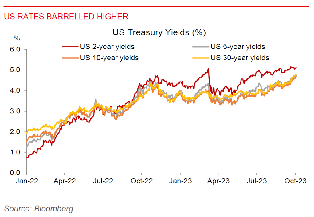 Winter has not yet come but the King in the North, that is the US Dollar, arose further. The move was somewhat more Euro-centric, with EURUSD declining by close to 1 big figure to 1.048, while Asian pairs such as USDCNH and USDJPY rose by relatively less thus far to 7.32 and 149.87. 10-year US rates barreled higher to 4.67%, JGBs yields inched up even as the BOJ intervened to slow the yield increase, while risk assets and the S&P500 fell by 1.1%.