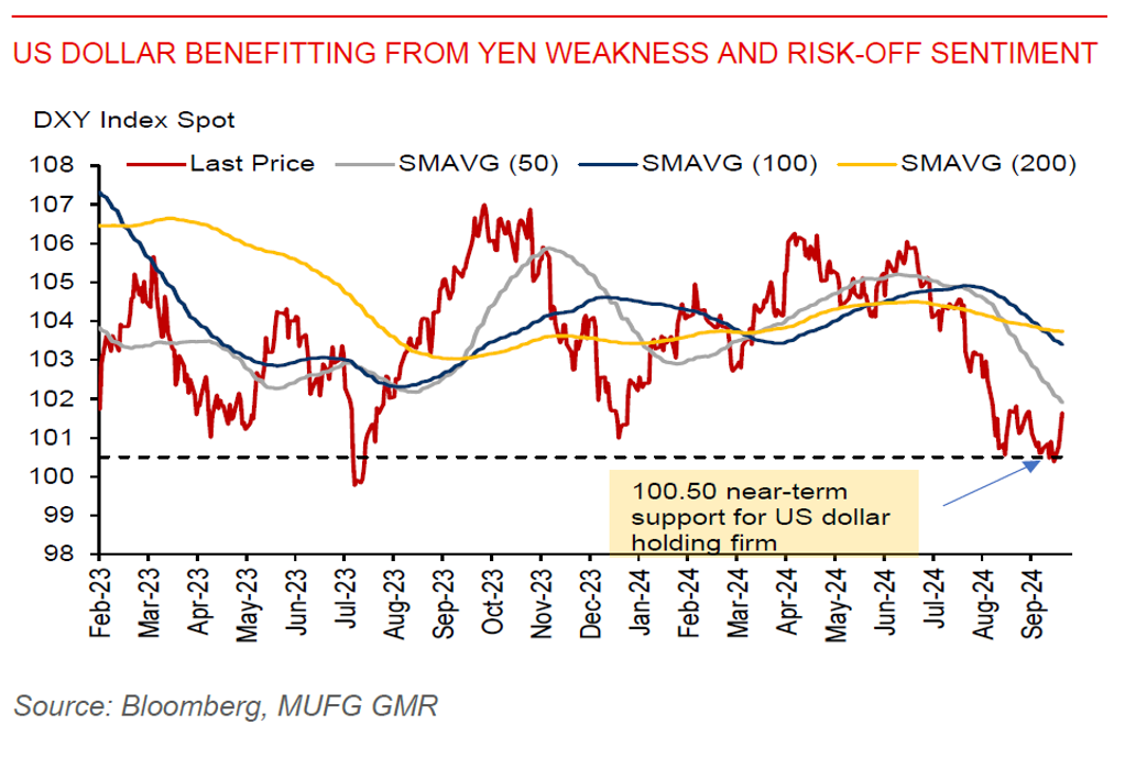 The US dollar index extended its gains by 0.4% on Wednesday’s session, with the 100.50 support level continuing to hold firm. The September US ADP employment data shows that the private sector added 143k jobs, picking up from 99k in August and beating Bloomberg consensus for 125k increase. The rise by 3 big figures in USDJPY has also supported the US dollar index. This follows from comments by Japan’s new Prime Minister Ishiba that the Japanese economy is not ready for further interest rate hikes. BoJ Governor Ueda also delivered a dovish signal to markets following his meeting with PM Ishiba. He said that the global economic outlook is uncertain and financial markets are unstable, so the BoJ will be watching these global developments with a high sense of urgency for now.