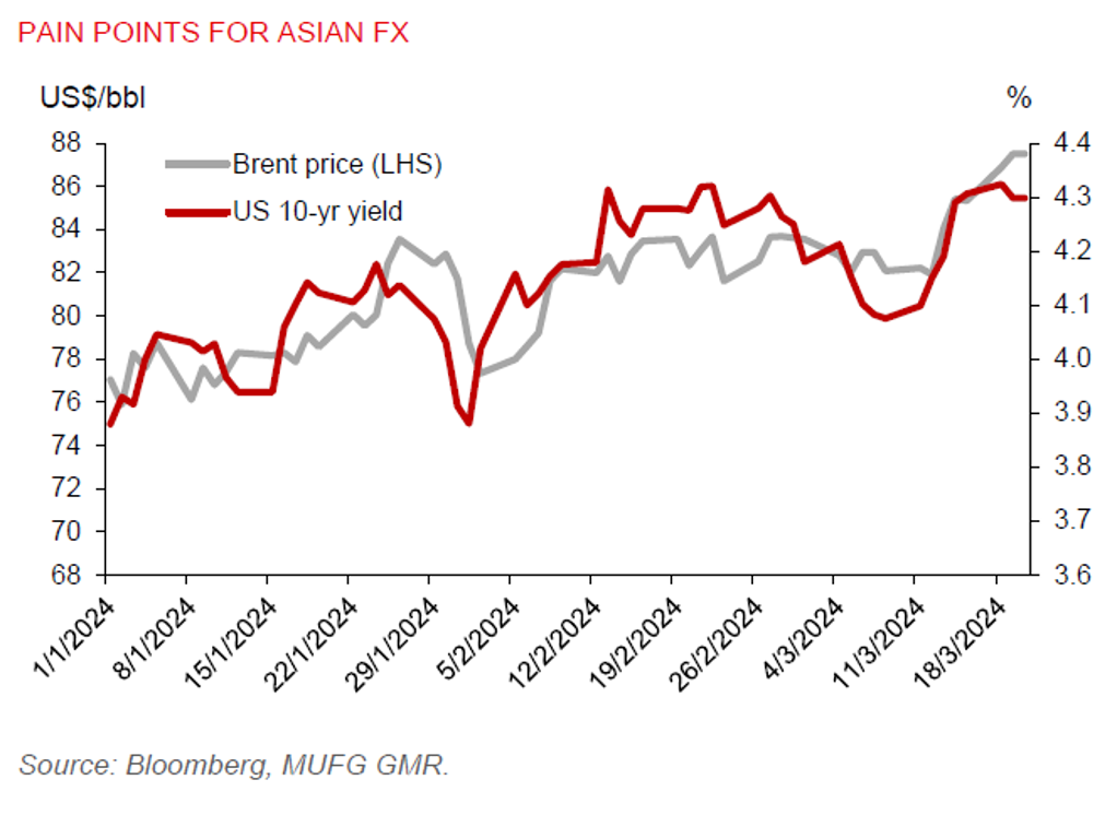 Markets now turn their focus to the upcoming FOMC meeting, where Fed officials will update their quarterly economic outlook and dot plot chart. We think the US Fed will keep its policy rate unchanged, while the updated dot plot could show a less dovish Fed. US core inflation has been sticky, labour market still resilient, while housing starts bounced back sharply in February. Markets are now pricing less than 3 US rate cuts this year as well as a higher probability that the first cut will come in September.