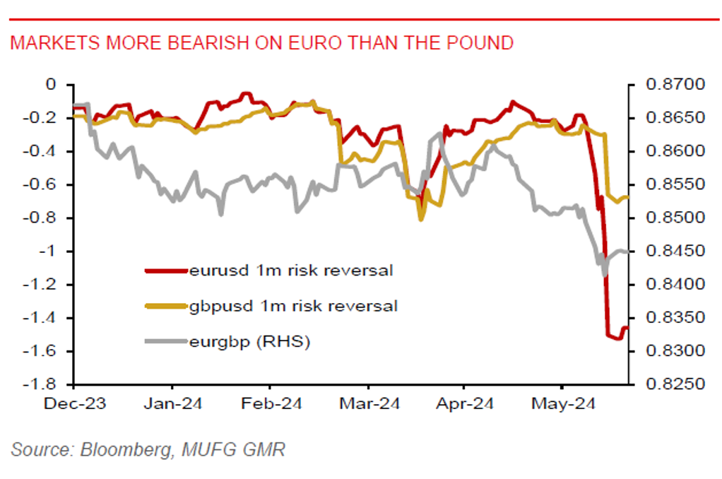 Both France and the UK face election uncertainty but the market impact appears to diverge. Market sentiment has turned more bearish on the euro. This is the most since 2022 when the euro dropped below parity against the US dollar. FX positioning has turned net short on the euro, while the CAC 40 index has broken the 200-day moving average. In a latest opinion survey by Ifop on 17 June, it showed Le Pen’s National Rally would garner one-third voter support in the first legislative election round on 30 June, a left-wing alliance called New Popular Front would get 26.3%, while President Macron’s Renaissance Party would come in third on 18%. Macron still has about 3 years left in his second presidential term, while a victory for Le Pen’s party in the 577-seats lower house of parliament that falls short of an outright majority would lead to a hung parliament, making legislation difficult to pass. Moreover, there is risk to the fiscal outlook under Le Pen’s party, with the first measure possibly a sales tax cut on energy.
