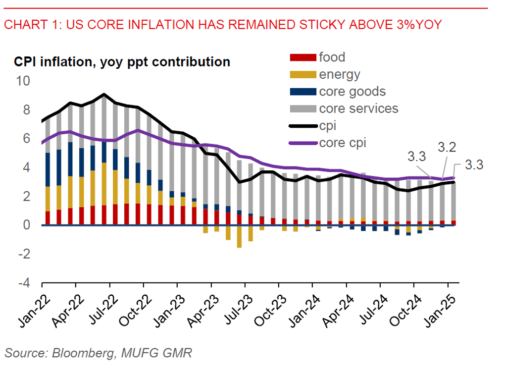 US headline inflation rose 0.5%mom in January, from 0.4%mom in December and larger than Bloomberg consensus of 0.3%. This was mainly due to core services inflation, which was up by 0.5%mom, contributing 0.3ppt to the month-on-month headline inflation rate. Contributions from core goods and food categories had also risen slightly. And from a year ago, headline inflation was 3.0%yoy, up from 2.9%yoy in December.