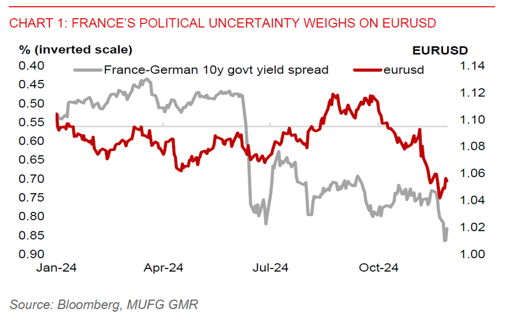 French bonds and EURUSD have come under pressure amid political uncertainty in France. Markets are concerned about an impasse in passing the budget for 2025. Marine Le Pen’s far right National Rally party opposes plans to raise electricity taxes. It appears that Prime Minister Michel Barnier could make concessions, failing which Le Pen’s party could trigger a ‘no confidence’ vote to topple his administration. France’s 10-year yield has now matched that of Greece for the first time on record, while the spread with German’s 10-year bond yield has widened to 86bps at one point, higher than during the snap election in France in mid-2024, before somewhat easing to 83bps. This, along with sustained US dollar strength and Trump’s potential tariff hikes, will likely continue to weigh on the EURUSD.