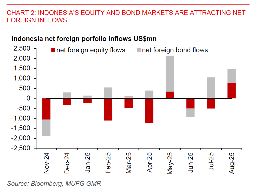 However, dollar weakness only modestly lifted several other Asian currencies, with CNH, KRW, and THB each gaining 0.4% since Powell’s speech last Friday, while SGD rose 0.3%. High-yielding currencies like the INR (-0.5%) and PHP (-0.2%) have underperformed, though IDR has remained steady. In particular, India may have to brace for additional 25% US tariffs, which would bring total tariffs to 50%. For Indonesia, while Bank Indonesia’s 25bps rate cut in August has somewhat undercut the rupiah’s appeal, net foreign inflows into local bond and equity markets will help stabilize the currency. With less than 40% of the government budget being disbursed in H1, there will be more fiscal support for the Indonesian economy in H2.