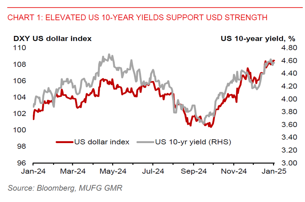 The broad US dollar index (DXY) rose by 7.1% in 2024, driven by significant weakness in the euro (-6.2%) and the Japanese yen (-11.5%). There is likely still room for the US dollar to strengthen towards the 110.00 level. US long-term yields could remain elevated, supported by Trump's inflationary policies such as trade tariffs and a wider budget deficit, which could further bolster US dollar strength. Since the US election on November 5, the US 10-year yield has increased by nearly 30bps to 4.5690%, and it had risen by 68bps in 2024.