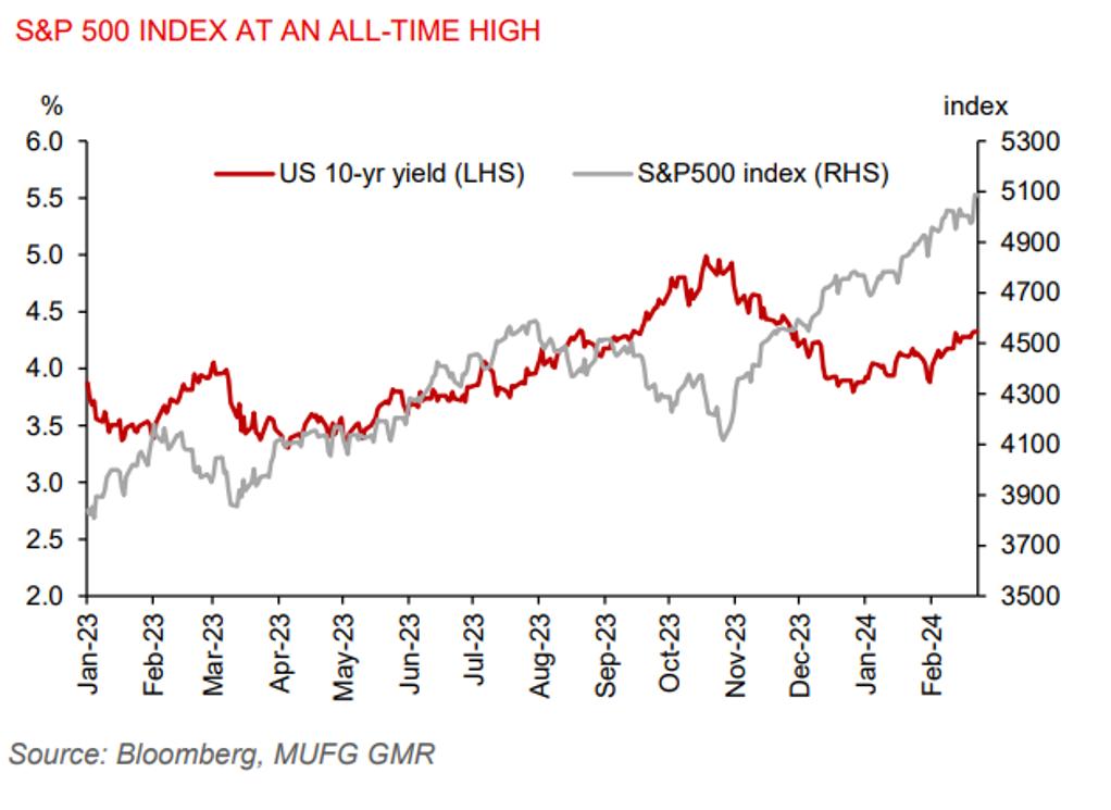 US initial jobless claims fell to 201k in the week ending 16 February, from a revised 213k in the week prior, underscoring continued resilience in the labour market. US manufacturing PMI rose to 51.5 in February from 50.7 in January. US services PMI eased to 51.3, from 52.5 in January, but remained in expansionary territory (>50). Existing home sales were up 3.1%mom to a seasonally adjusted annual rate of 4mn units in February. Meanwhile, US Fed Vice Chair Jefferson said it is appropriate for the Fed to start easing later this year, but he has warned against “easing too much”, as this could stall or reverse the progress made in restoring price stability. The US dollar index was little changed, while the US 10-year yields inched higher to a year-to-date high of 4.33% as markets dialed back rate cut expectations. Resilient US economic data and strong Nvidia earnings have supported risk appetite for US equities.