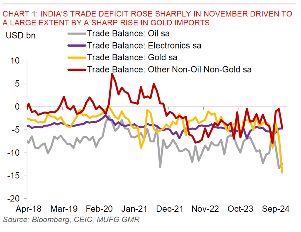 Asian currencies were mixed to weaker, with IDR (-0.47%), KRW (-0.48%), and PHP (-0.75%) underperforming while USDCNH rose to 7.292. India’s goods trade deficit widened materially to US$37.8bn in November from US$27.1bn the previous month, the largest on record. The details showed this widening was to a large extent contributed by gold imports, with the gold trade deficit rising from US$6.5bn in October to US$14.5bn in November. Meanwhile, the oil trade deficit remained elevated at around US$12.3bn while the non-oil non-gold deficit widened as well to US$9.2bn from US$5.2bn. The good news is that India’s services trade balance rose to US$18.4bn from US$16.6bn, providing some partial offset to the much larger goods trade deficit. Overall, we are hesitant to extrapolate and say that India’s goods trade deficit will remain this large moving forward. For one, the oil deficit looks too large relative to where oil prices are right now. Second, while India’s gold import duty cuts have boosted gold demand more than we have anticipated, it’s unclear whether gold demand should continue at this same rate moving forward. Overall, we continue to see USD/INR rising steadily towards 85.2 by 1Q2025 and 86.0 by end-2025 given the less benign domestic growth and foreign portfolio inflow environment. With the larger trade deficit released, we are also watching out closely for whether USD/INR volatility picks up from here. Our base case is that RBI will continue to remain an important player in the market by intervening to cap realized FX vol, but the new RBI Governor coupled with a new look Monetary Policy Committee next year may raise some risk of a change in RBI’s FX intervention reaction function in 2025.