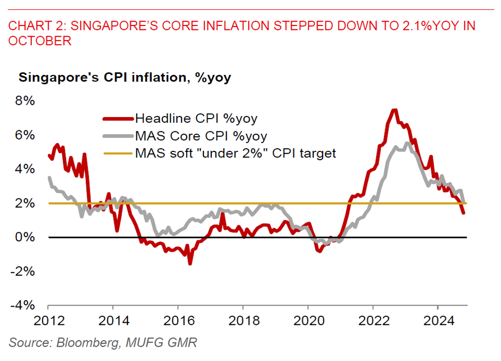 Singapore’s disinflationary trend has been well-entrenched, with core CPI (ex-private transport and accommodation) moderating to 2.1%yoy (-0.3%mom) in October from 2.8%yoy in September. The pace of disinflation was faster than our expectation of 2.5%, reinforcing our view that the MAS will ease its tight policy setting in January 2025. The deceleration in price gains was mainly due to easing inflation in services, electricity and gas, retail, and other goods. We maintain our outlook for core inflation to ease to under 2% by end-2024, giving room for MAS policy easing. Moreover, we think the balance of risks will shift to growth as Trump is likely to impose some form of tariffs on China, which would have negative spillover effect on Singapore’s economy. Meanwhile, Singapore’s headline inflation slowed to just 1.4%yoy in October, from 2%yoy in September, underpinned by lower core inflation, a decline in private transport inflation, and slowing accommodation inflation.