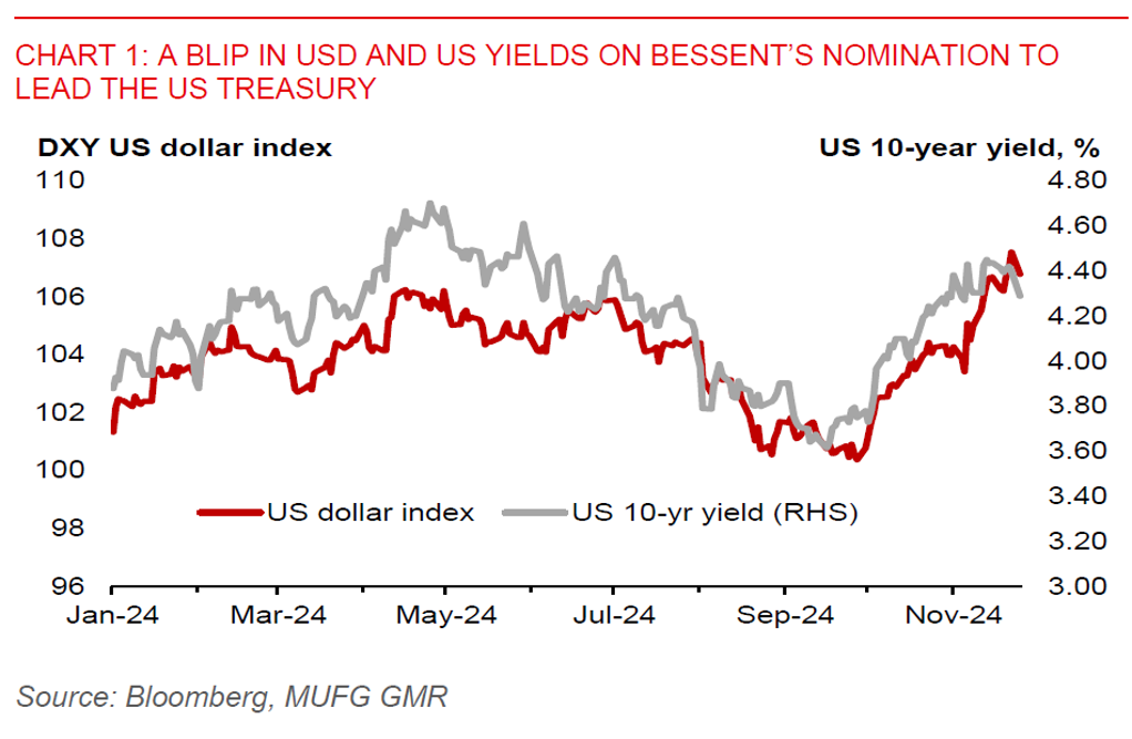 The US dollar index (DXY) fell 0.7% on Monday, while the US 10-year yield declined by more than 12bps to 4.27%, following Donald Trump’s nomination of Scott Bessent as US treasury secretary. EURUSD has also picked up modestly but stayed below the 1.0500-level. Bessent has possibly been seen by markets to take a more measured approach to imposing trade restrictions, easing market concerns that Trump could go to extremes with tariff hikes. The OIS markets have pared back expectations for Fed rate cuts to just 68bps through end-2025, compared to about 110bps of cuts being priced before the US election results. We believe market reaction to Bessent’s nomination may just be a blip for the US dollar. A likely renewed market focus on US tariffs in early 2025 would still support the US dollar.