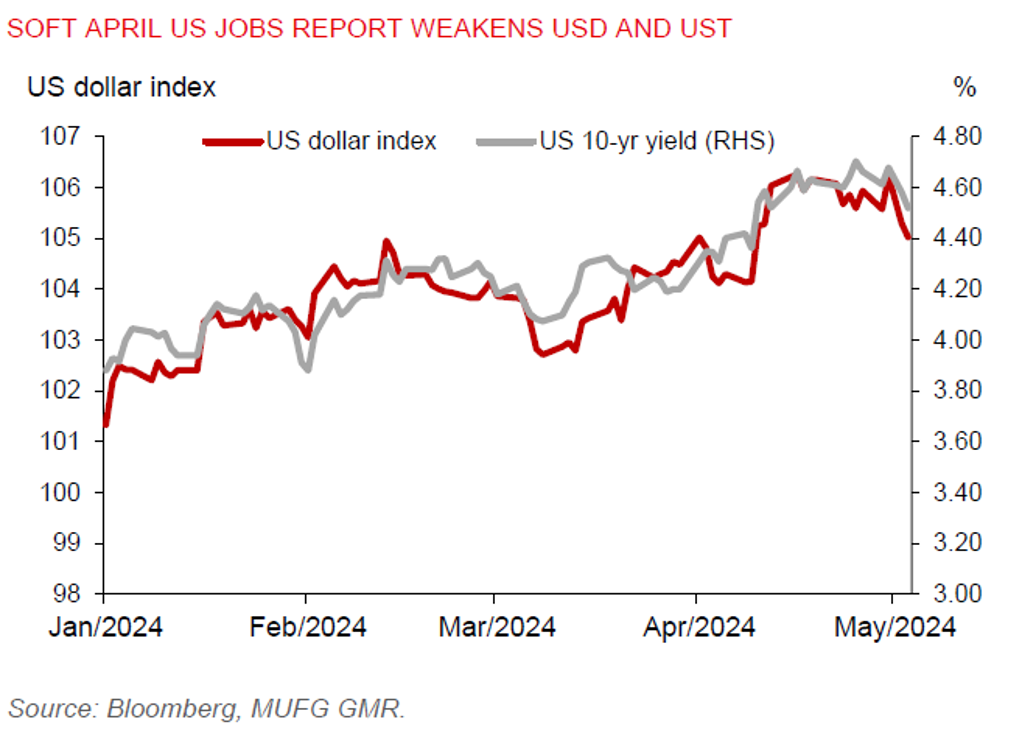 US Treasuries rallied and the broad US dollar index sold off following a soft April US jobs report. Nonfarm payrolls rose 175k in April, down from a revised 315k in March and below Bloomberg consensus of 240k. The US unemployment rate inched up by 0.1ppt to 3.9%, while wage growth slowed to 3.9%yoy from 4.1% in March. The ISM services index fell to 49.4 (below 50 indicates contraction) in April from 51.4 in March, the first contraction since December 2022 and below market expectation of 52. But the ISM services prices paid index rose to 59.2 from 53.4 in March.