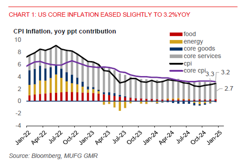 Notably, core inflation was 0.2%mom in December, down from 0.3%mom in November and less than Bloomberg consensus of 0.3%. From a year ago, the core gauge slowed to 3.2%yoy from 3.3%yoy in November. With core inflation finally easing, the Fed is likely to stay on its rate-cutting cycle. The broad US dollar index (DXY) fell 0.3% to below the 109.00-level, extending the 0.6% fall in Tuesday’s session. US 2-year yield fell 10bps while the 10-year fell about 14bps following the inflation report.