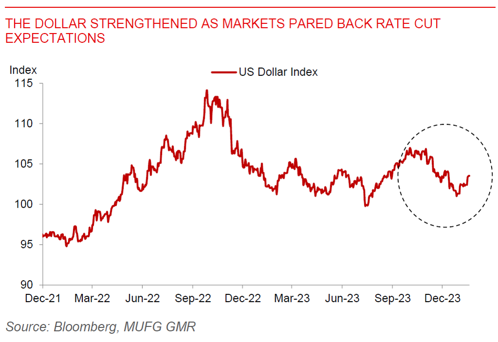 US initial jobless claims came in lower than expected at 187k, the lowest since September 2022, while continuing jobless claims also fell to 1806k, indicating a still resilient US labour market, at least so far. Meanwhile, Japan’s December National CPI was marginally higher than expected, which keeps open the possibility of a rate hike by the Bank of Japan in 1H2024. JPY has been the weakest G10 currency year-to-date as markets reassessed both the pace of US rate cuts, and also on the back of recent earthquake in Japan which likely delays policy normalization by the BOJ.