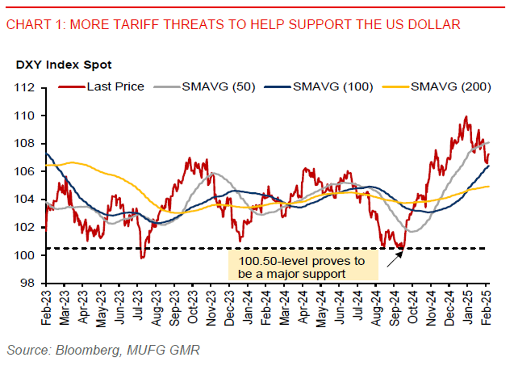 The US dollar (DXY) has found near-term support following President Donald Trump’s latest threat to impose 25% tariffs on autos, pharmaceuticals, and semiconductors. This could be implemented as early as 2 April, after an ongoing US review of its trade relations with trading partners, which is set to conclude on 1 April. DXY rose 0.1% to the 107.20 level in Wednesday’s session, extending gains for a second day. Meanwhile, US Treasury bond yields have not moved much, with the US 10-year yield still staying elevated at above 4.50%.