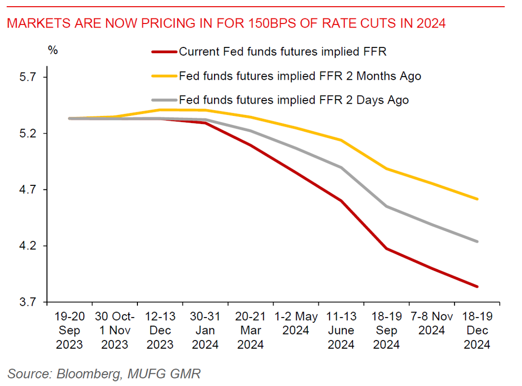 There was a monumental move in markets overnight. The futures market is now pricing in for 150bps of rate cuts in 2024, the Dollar fell by close to 1%, US 10-year yields dropped to 4%, while the S&P500 rose by 1.4%. All this even as oil and commodity prices remained relatively stable, going some way to reduce inflation fears down the road.