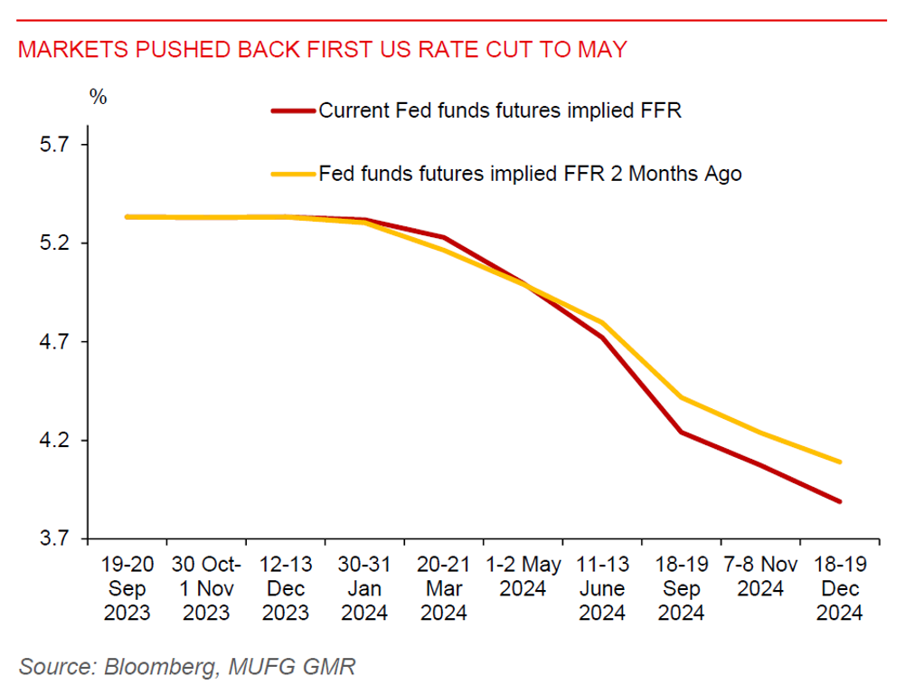 The futures market is still pricing in 144bps of rate cuts in 2024, only slightly lower than the day before, but pushed back timing of a rate cut to May. Market reaction has been relatively muted.