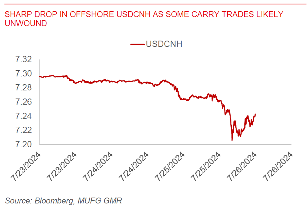 The big moves in markets continued, with global equity markets selling off further, weak trends in industrial metals, together with the sharp strengthening in JPY against the Dollar. In Asia, all these trends have also interestingly spilled more recently into the offshore Chinese renminbi, with USDCNH dropping sharply from 7.26 to 7.20 at one point in time yesterday, before recovering somewhat post the stronger than expected US GDP data. It’s hard to know exactly what caused these moves, but some positioning unwinds perhaps of FX hedges and carry trades in CNH/CNY probably make sense to our minds. Moving forward, the fundamental story of China and CNY remains one where more stimulus is needed to support the economy, and over here, while we think there will be more forthcoming, end-July’s Politburo meeting will be important in this regard.