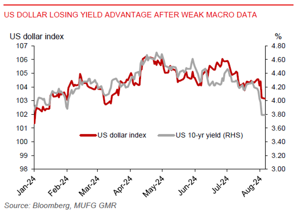 Weak US jobs data and fears of a hard landing triggered a shock to US markets on 2 August, with the US dollar down by 1.2%, S&P500 sold off by 1.8%, while US 10-year yields fell by 19bps. Volatilities in bond and equity markets are now back again.