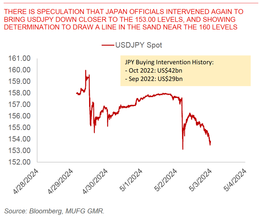 USDJPY fell sharply from 158.00 closer to 153.00, in what seemed like another potential episode of FX intervention by Japan officials. There was no official confirmation by authorities, but news reports and analysis were suggesting that the Bank of Japan possibly sold around US$23bn, and this comes on the heels of suspected intervention earlier this week to the tune of around US$30bn. To put these numbers in perspective, Japan sold around US$42bn over 4 days in October 2022, and around US$29bn in September 2022, and the suspected intervention may have been slightly larger thus far.
