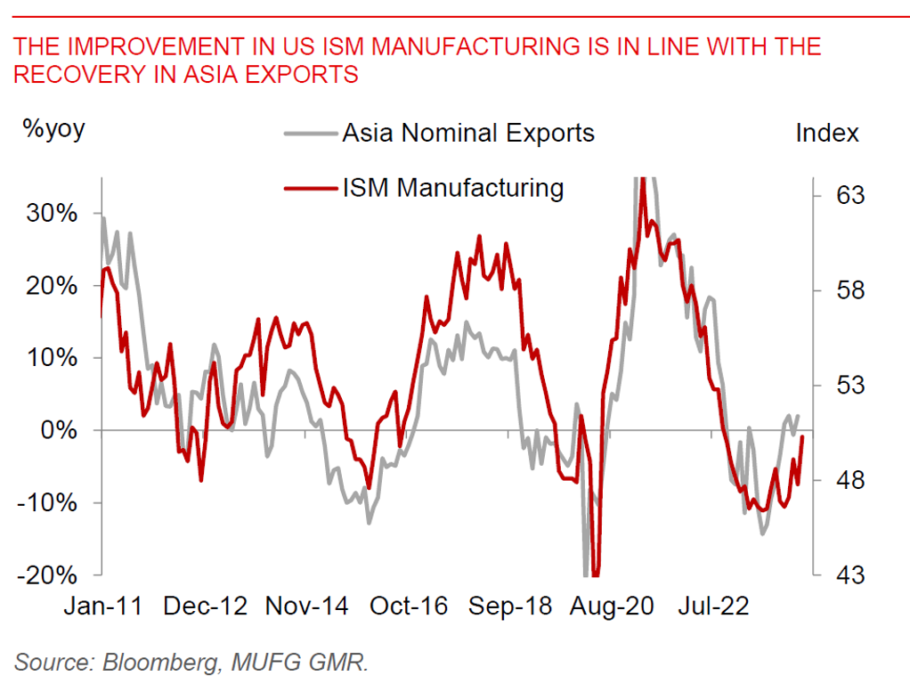 The US ISM Manufacturing Index rose into expansionary territory for the 1st time since Oct 2022 at 50.3 from 47.8 the previous month. This was driven up by both the production and also forward-looking new orders components, coupled by a smaller contraction in inventories. The colour from the ISM survey were also quite instructive, with a chemicals company saying that performance continues to “defy projections of a downturn in activity”, while a wood products company saying that “many manufacturers are anticipating better business in the second quarter and much better in the third quarter”. To be sure, not all the comments were positive, but it certainly jives with regional rebound in Asia exports and manufacturing that we have already seen.