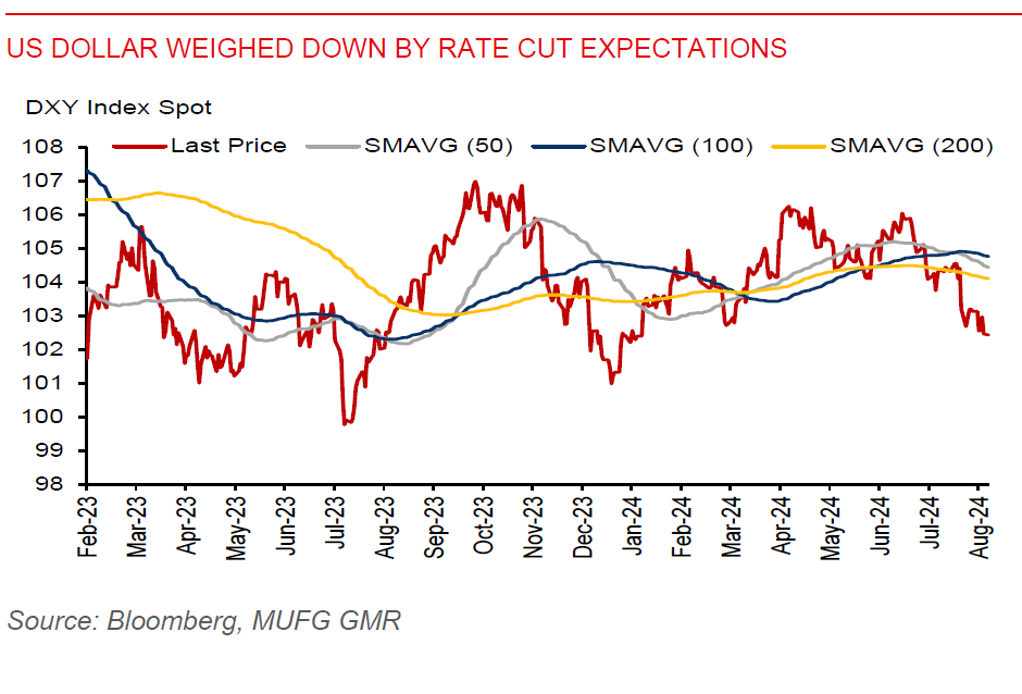 All eyes will be on the Jackson Hole economic symposium meeting this week, where major central banks will gather while Chair Powell is expected to provide his latest outlook for the US economy and inflation. With US macro data showing disinflation and growth still largely resilient, Chair Powell could provide a stronger signal that the Fed will proceed with rate cuts at the September FOMC meeting. The US dollar has been weaker since July, currently consolidating around the 102.00-103.50 level, while US 2y yield was slightly above 4%, with markets paring back some rate-cut expectations.