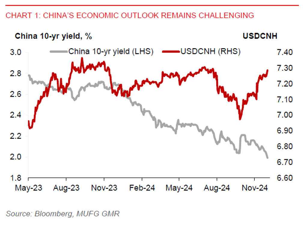 The broad US dollar index (DXY) bounced by 0.7% on Monday’s trading session following a 1.7% decline last week. This has partly been driven by ongoing political uncertainty in France over a parliamentary impasse in passing the 2025 budget, and partly by US President-elect Donald Trump’s tariff threats on BRICS nations. Marine Le Pen’s National Rally party (the largest in the lower house) has pledged to topple the French government after Prime Minister Michel Barnier used a constitutional tool to bypass parliamentary vote to push through part of his 2025 budget. EURUSD fell 0.7%, with the spread between France’s and Germany’s 10-year yield widening to 88bps. Euro-area manufacturing activity also stayed in contraction, with further weakness seen in Germany, France, and Italy. Meanwhile, US ISM manufacturing shows factory activity picking up to 48.4 in November, from 46.5 in October, but still staying in contraction.