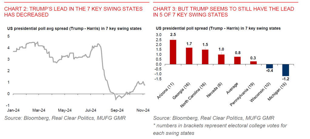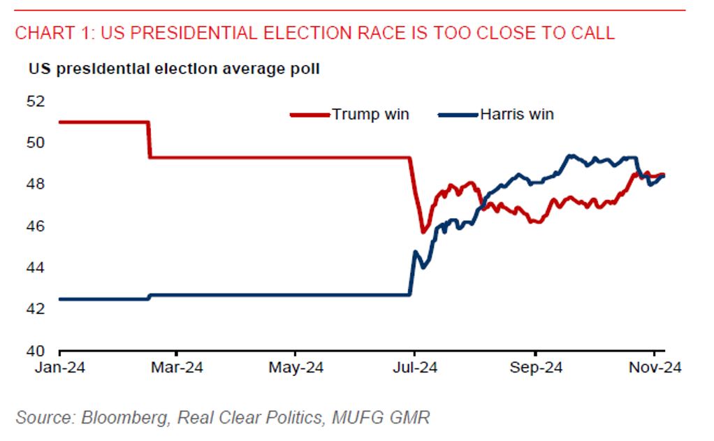 The US presidential election will be held today with far-reaching economic consequences for Asian economies. The election race has tightened and is neck to neck in key swing states. Market uncertainty is high, resulting in sharply rising volatility across Asian currencies. The implied volatility for USDCNH during the election week has surged to nearly 15%, which is the highest on record based on available Bloomberg data.
