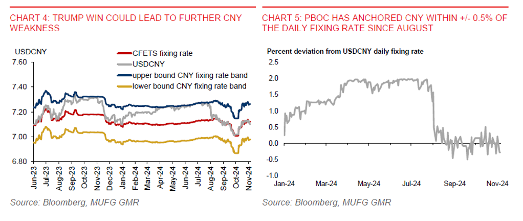 Asia ex-Japan currencies have appeared to price out some “Trump trades”, with KRW (+0.7%), SGD (+0.5%), and CNH (+0.5%) leading gains against the US dollar during US election week. Notably, the PBOC has anchored onshore CNY within +/- 0.5% of its daily fixing rate since August. A Trump win could still lead to a weaker CNY with spillover effects on regional currencies. But there is little reason for a sharp CNY devaluation until there’s clarity on the timing and scope of duties to be imposed on China, if any.