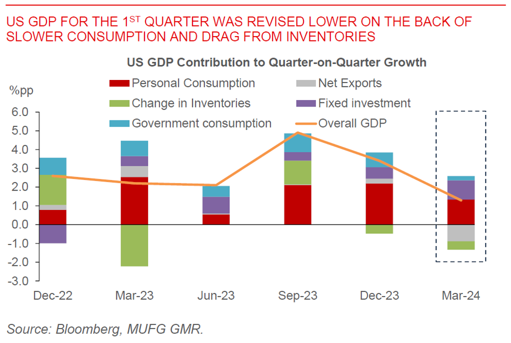 The US economy grew at a slower pace in the first quarter than initially estimated, primarily reflecting softer consumer spending on goods, with the Dollar weakening and US yields coming off. GDP rose 1.3% annualised in the 1st 3 months of the year, with consumption rising 2% compared with the provisional estimate of 2.5%, with also a larger drag from inventories. Nonetheless, this was partially offset by stronger business and residential investment. Meanwhile, the Fed speakers overnight including NY Fed President John Williams continue to highlight that policy is in a good place to continue to bring inflation down, with some also giving a nod to recent signs of a slowdown as evidence of that. There was a range of views and debates on the neutral rate with Bostic and Logan highlighting the possibility that the long-term rate had risen, but John Wiliams cited demographic factors as structural reasons why the neutral rate was still low.