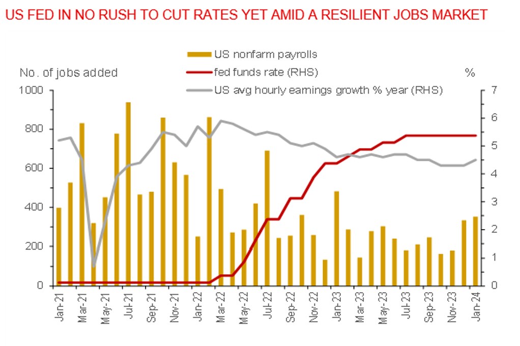 The strong US jobs report last Friday vindicated the US Fed’s decision to hold rates steady in January and push back against market expectations for a March rate cut. US nonfarm payrolls rose by 353k in January, accelerating from a revised 333k gain in December and soundly beating market consensus for a 185k expansion. Job gains were broad-based, led by professional and business services, healthcare, and retail trade. The unemployment rate held steady at 3.7%, while wages rose 0.6%mom (4.5%yoy), beating market consensus for a 0.3% gain (4.1%yoy).